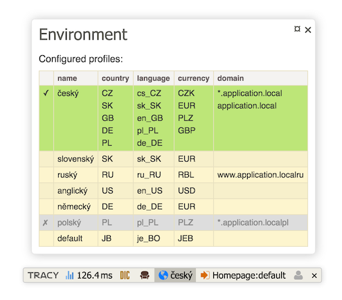 此功能根据扩展中的配置文件设置自动评估 Kdyby\Translation 的区域参数。如果将 translations.useDefault 设置为 TRUE,则可以使用默认配置文件的语言。如果此设置设置为 FALSE,则不会使用默认语言,并将调用其他解析器。此外,如果您通过方法 \SixtyEightPublishers\Application\Environment\ActiveProfile::changeLanguage() 更改语言,翻译器中的区域也会更改。