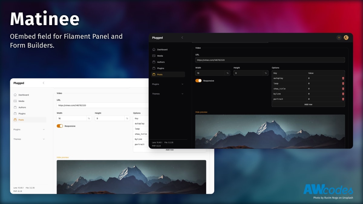 use Awcodes\Matinee\Matinee; Matinee::make('video') ->showPreview()