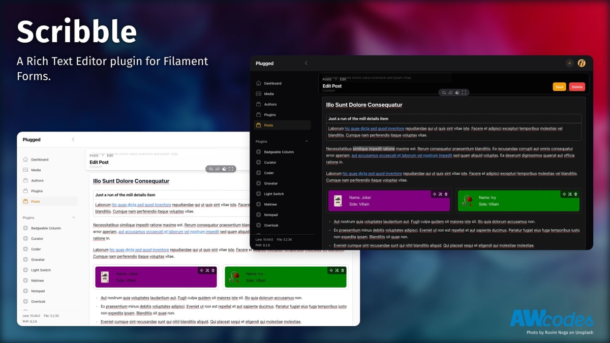 use Awcodes\Scribble\ScribbleEditor; public function form(Form $form): Form { return $form ->schema([ ScribbleEditor::make('content') ]) }
