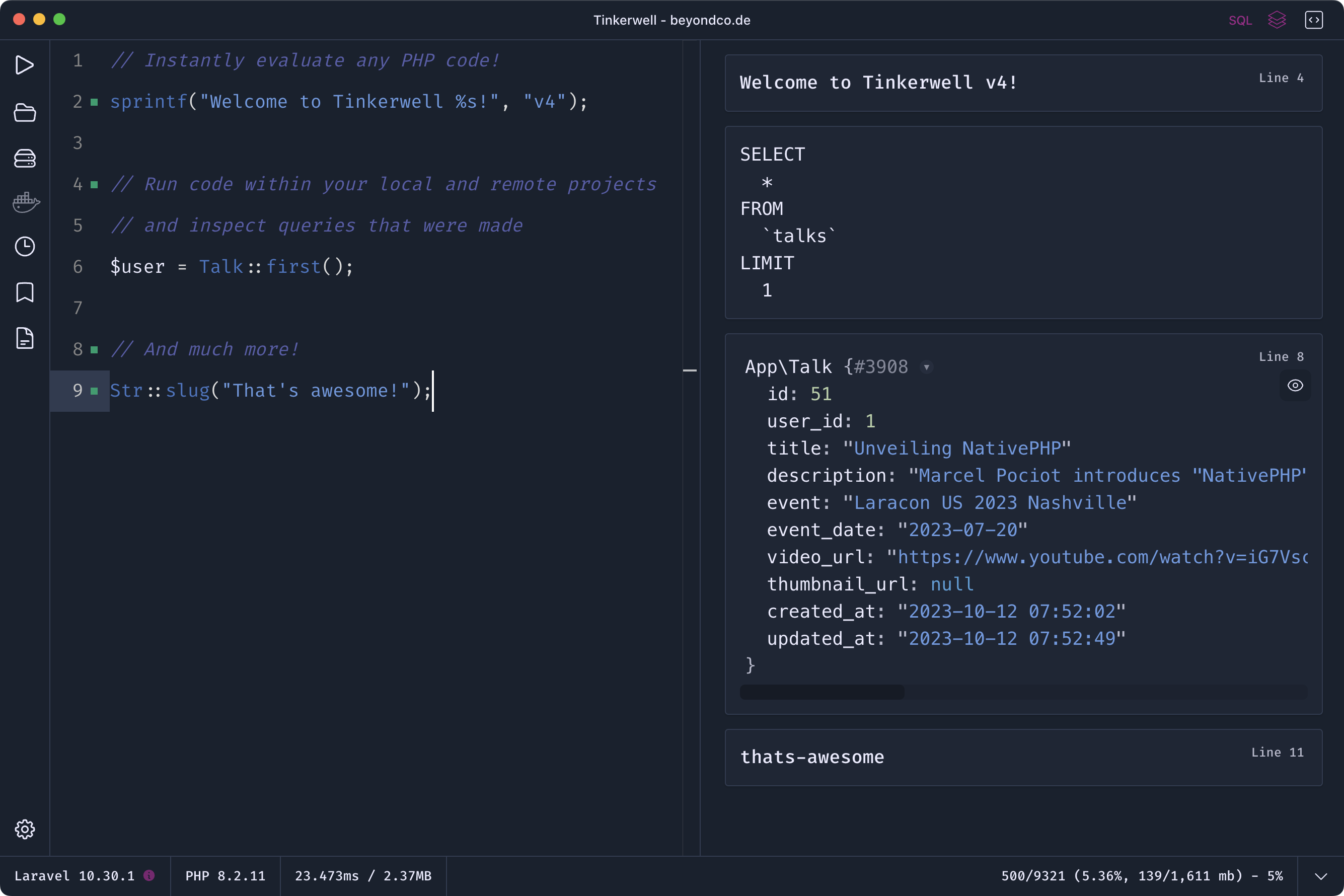 Tinkerwell是一个增强版的REPL。它允许您在应用程序的上下文中运行代码片段,而不需要触及浏览器。它是您最喜欢的IDE的完美伴侣,并且与任何框架兼容——本地、通过SSH、Docker,甚至Laravel Vapor。