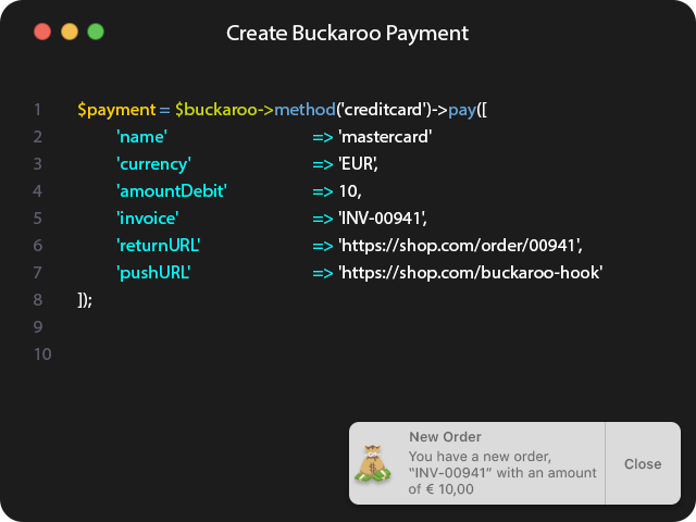 # Create a new payment $buckaroo->method('creditcard') // Input the desire payment method. ->pay([ 'name' => 'visa', // Request to pay with Visa 'amountDebit' => 10, // The amount we want to charge 'invoice' => 'UNIQUE-INVOICE-NO', // Each payment must contain a unique invoice number ]);