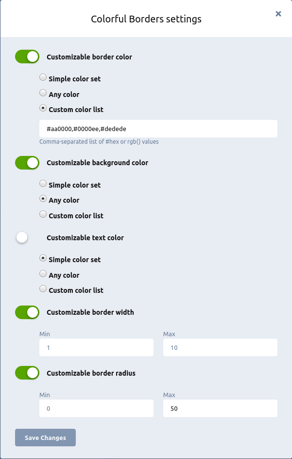 对于每个颜色设置,你可以选择内置的小色板中的颜色、通过浏览器颜色选择器选择的任何颜色,或者以十六进制或RGB值输入的由管理员提供的颜色列表。