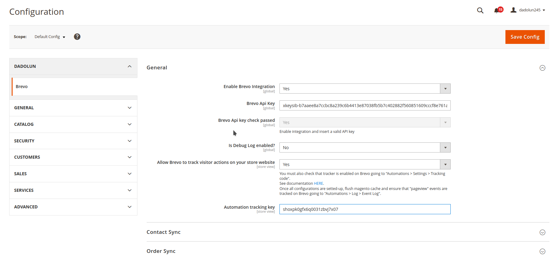 您必须从“商店 > 配置 > Dadolun > Brevo > 通用”部分启用模块,并添加您的Brevo API密钥: