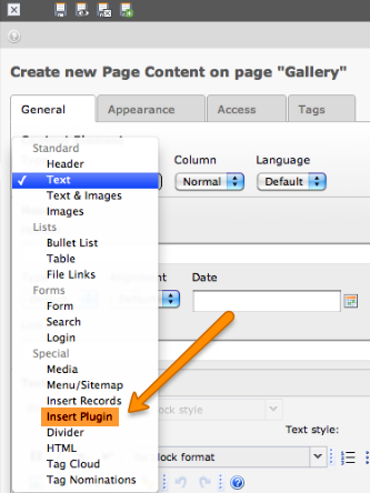 要在页面上安装一个图库,请点击应显示图库的页面并创建一个新的内容元素。