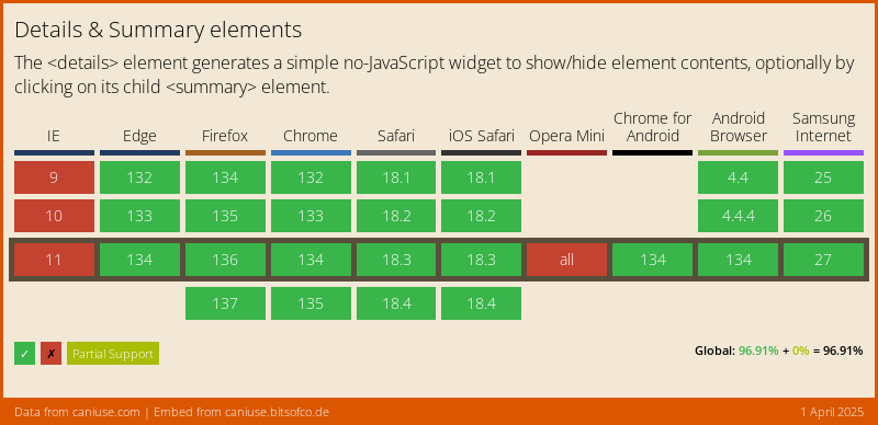 由于此扩展使用 <details> 和 <summary> 元素,因此此扩展与所有现代浏览器兼容,并支持96.26%的Web流量。