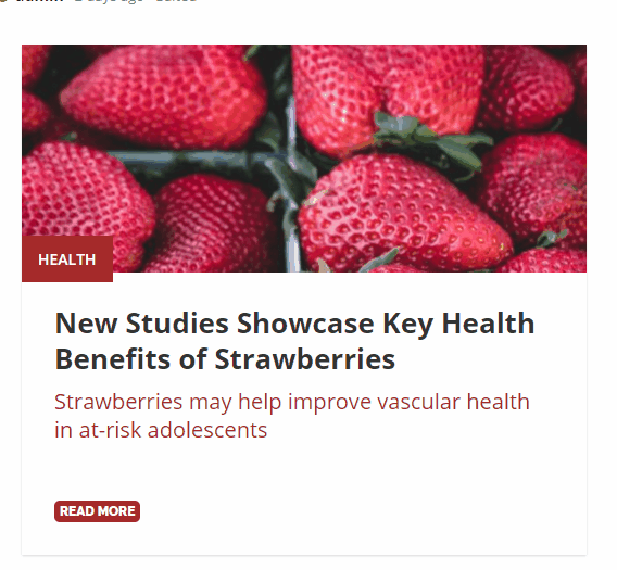 [CARD2]brown,https://unsplash.it/600,Health,New Studies Showcase Key Health Benefits of Strawberries,Strawberries may help improve vascular health in at-risk adolescents,This is the first study to test the impact of freeze-dried strawberry powder (FDSP) on markers of vascular health in at-risk adolescents. Previous research in adults found a promising inverse relationship between FDSP consumption and the risk of cardiovascular disease.In a randomized, double-blind, crossover study, 25 overweight or obese males between ages 14-18 consumed 50 grams of FDSP or a calorically equivalent amount of control powder every day for a week. Before and after each test period, measures of vascular health were collected at baseline and one hour after FDSP intake.[/CARD2]