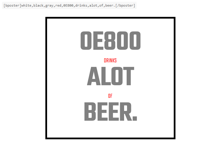 [BPOSTER]{COLOR},{COLOR2},{COLOR3},{COLOR4},{TEXT},{TEXT2},{TEXT3},{TEXT4},{TEXT5}[/BPOSTER]