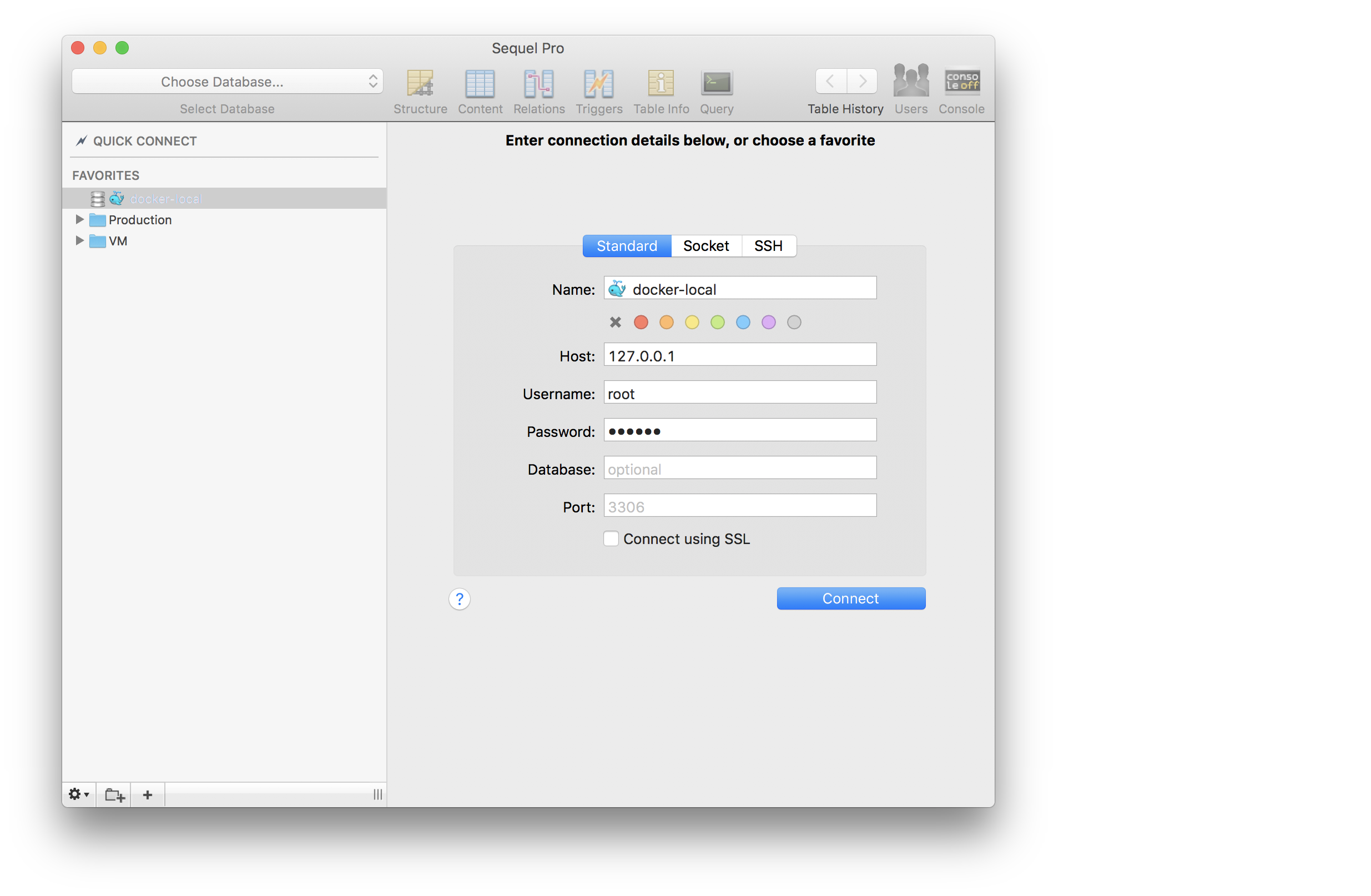 由于我们将MySQL绑定到端口3306,SequelPro可以直接访问数据库。