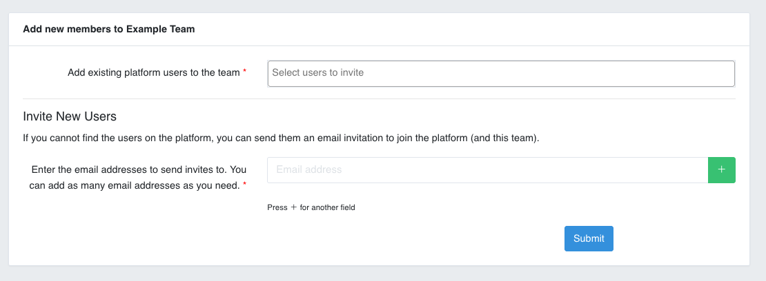 邀请成员表单有2种添加成员的方式。您可以直接搜索现有应用用户并添加他们,或者您可以发送平台外的电子邮件邀请给人们。您可以将任意多个电子邮件地址添加到表单中,每个地址都会分别发送电子邮件。
