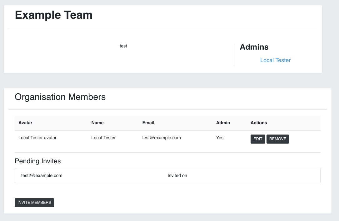 - 管理团队成员(通过“预览”链接)。这使用Backpack的“显示”操作和自定义blade模板。在此页面上,您可以邀请或添加新成员,将现有成员设置为团队管理员或普通成员,或从团队中删除用户。