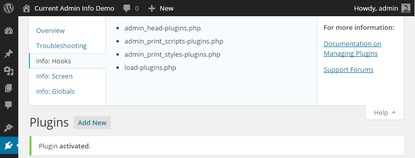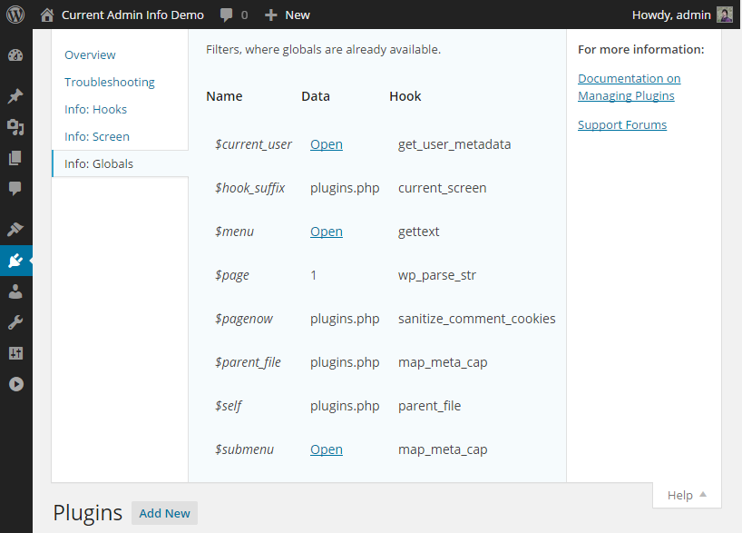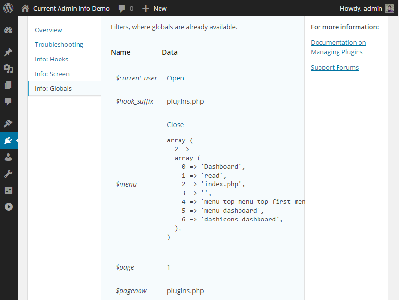 显示当前管理屏幕及其全局变量、上下文钩子等信息。